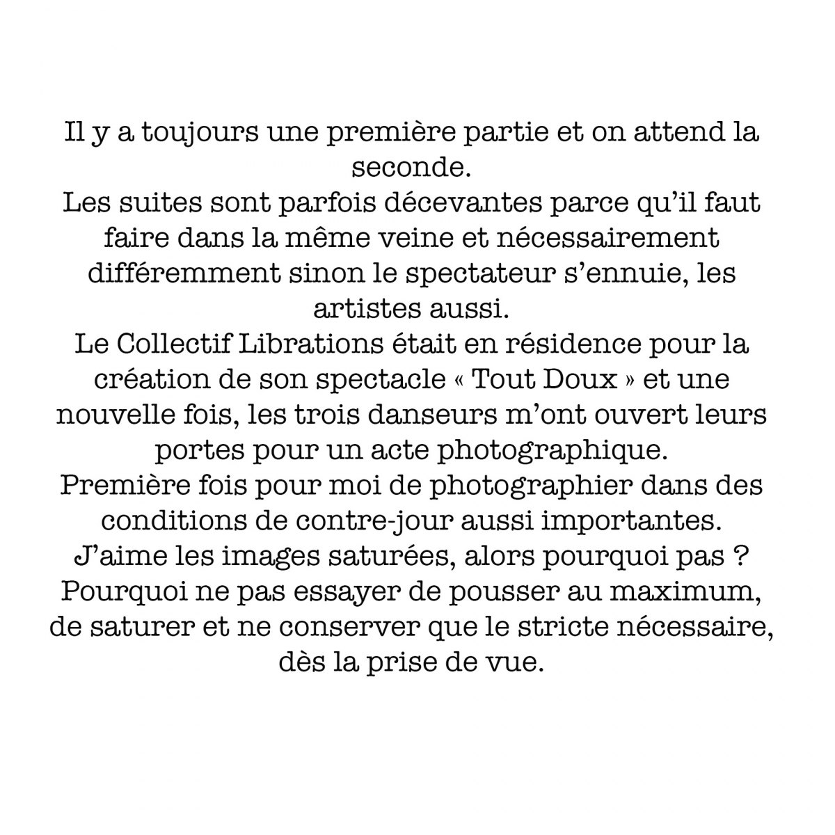 Au risque de me répéter souvent, mais tout commence par la photo, toujours avec l’appareil pour saisir les instants, scènes du quotidien, les évènements urbains. Lors d’une représentation en extérieure d’un spectacle « La Soupe au Pistou », spectacle participatif, j’ai réalisé quelques clichés et comme à mon habitude, j’aime bien que les photos prises aillent à la personne concernée. A partir de là, le collectif Librations m’a permis d’assister à deux répétitions d’une création de leur nouveau spectacle « Tout Doux ». Je vous livre ici les clichés de la dernière séance en résidence à La Comète à Saint-Etienne. Merci à Thaïs Desveronnieres, Agathe Saurel, Léo-Paul Martinello pour leur accueil et la liberté qu’ils m’ont laissé.