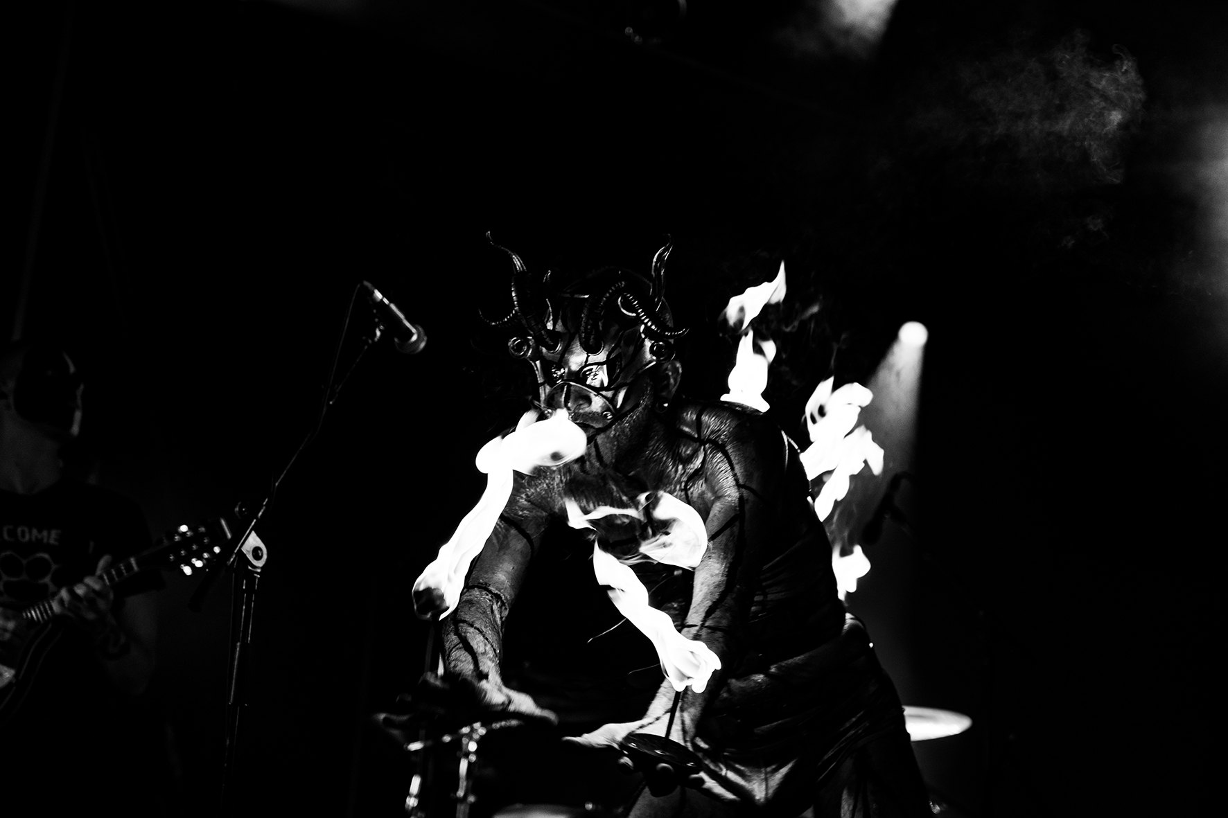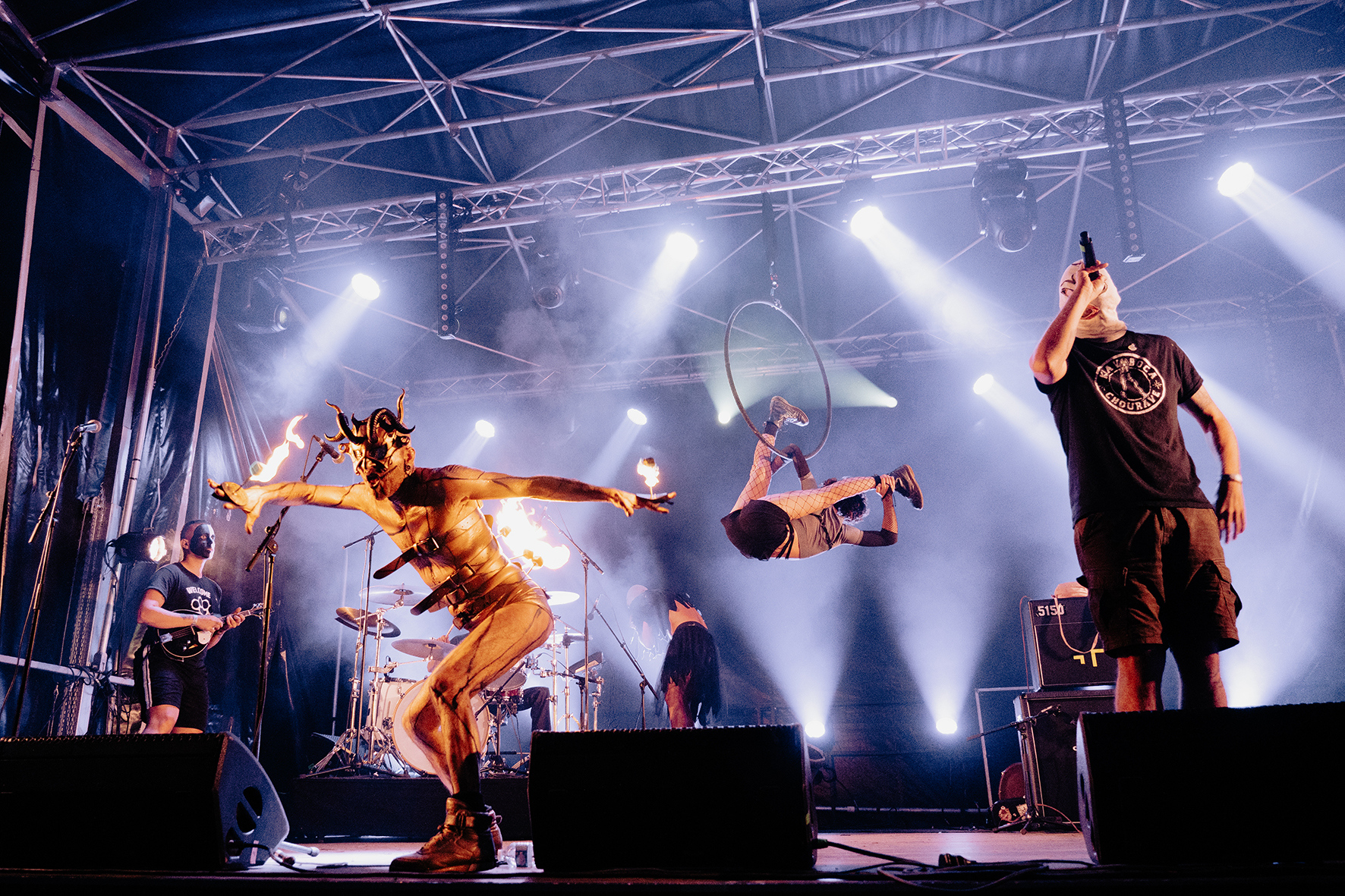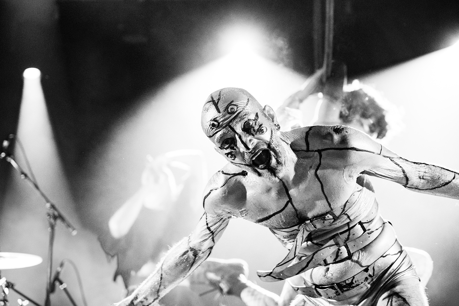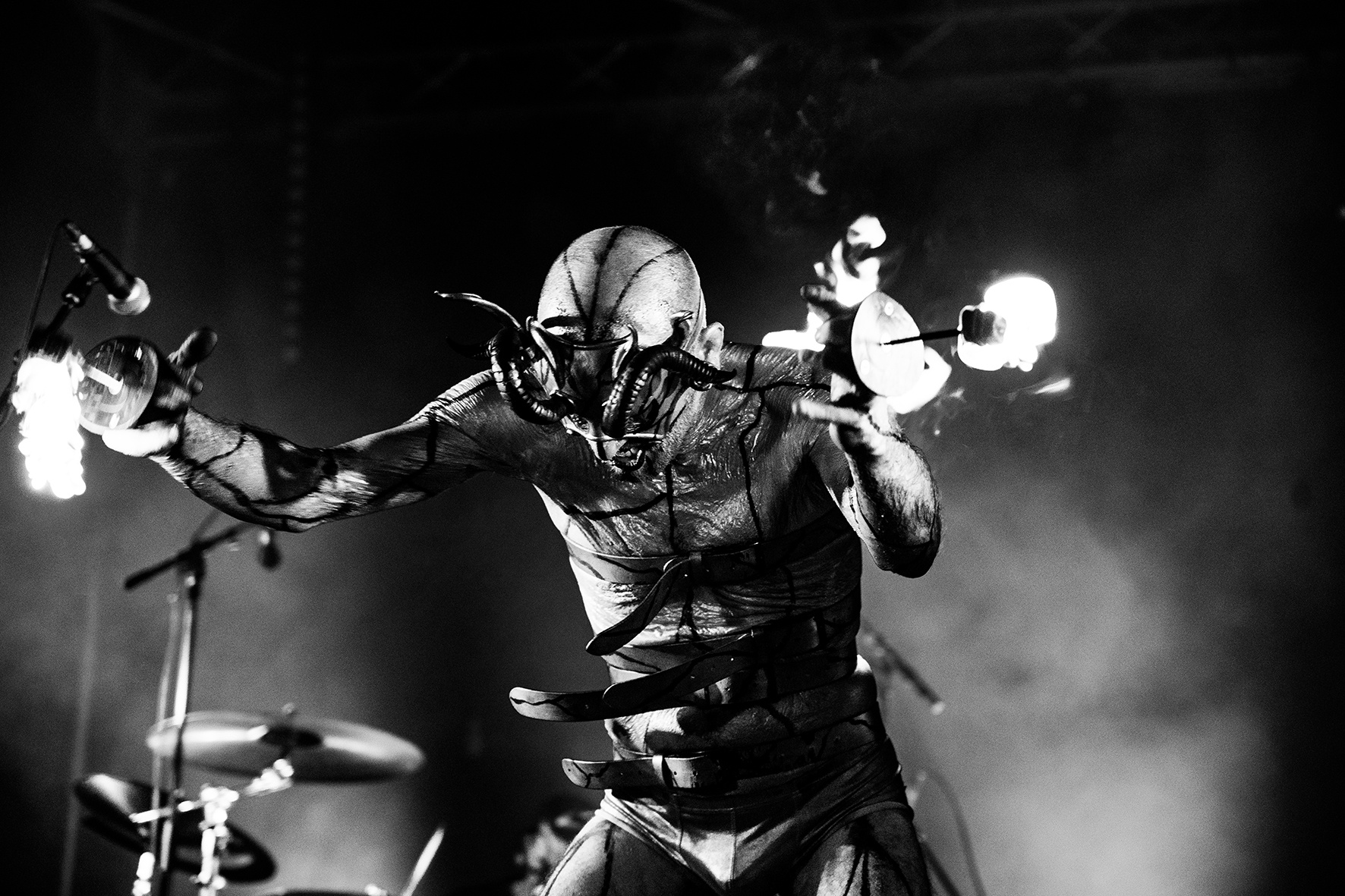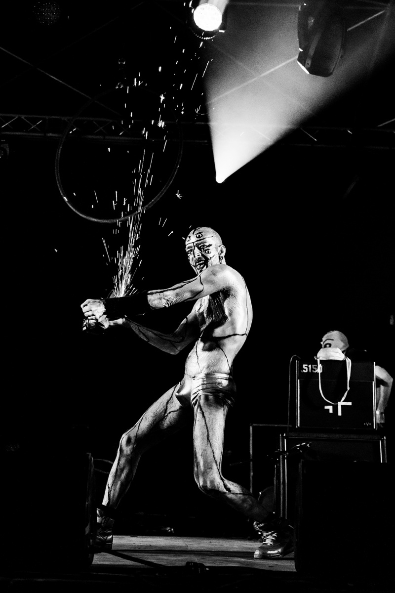 Il y a des concerts qui ne laissent pas indifférent, lorsqu’on fait de la photo. La troupe de Krave Boca oscille entre le show pyrotechnique et musicale, une recherche de la mise en scène extrême menée par une musique hurlante et rythmée. Les yeux et les oreilles sont sans cesse sollicités, pas de répit pour le corps non plus, en mouvement solitaire ou conduit par les vagues collectives, le corps bouge, exulte, se fatigue mais la troupe Krave Boca le soutient jusqu’au bout.