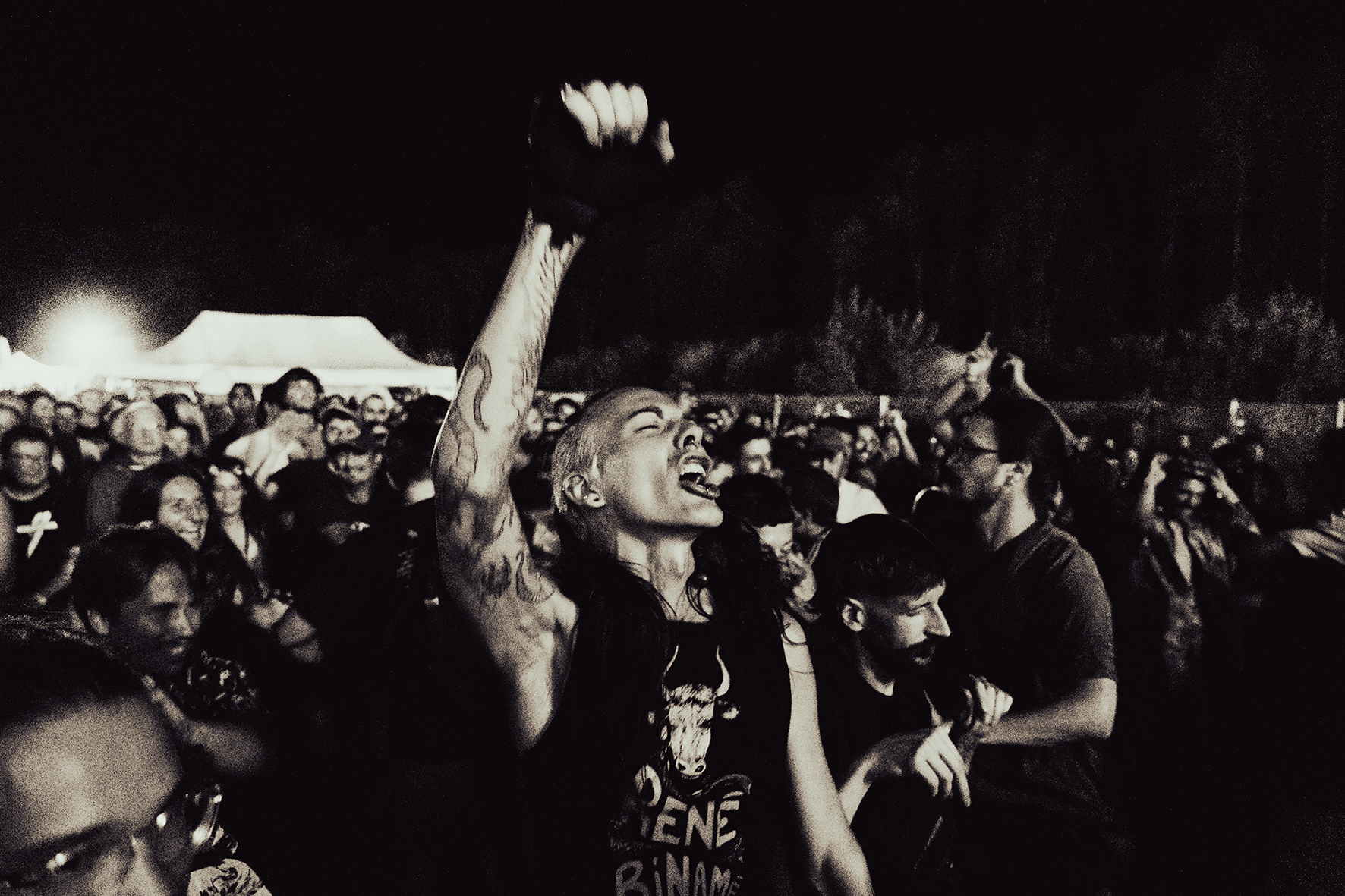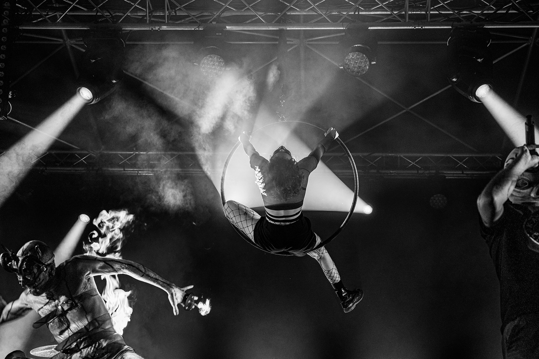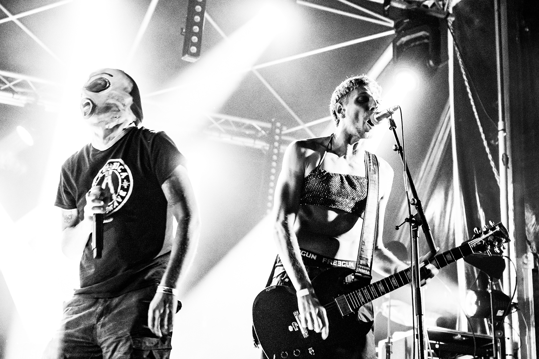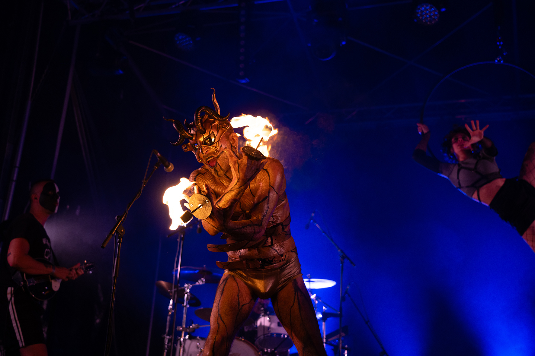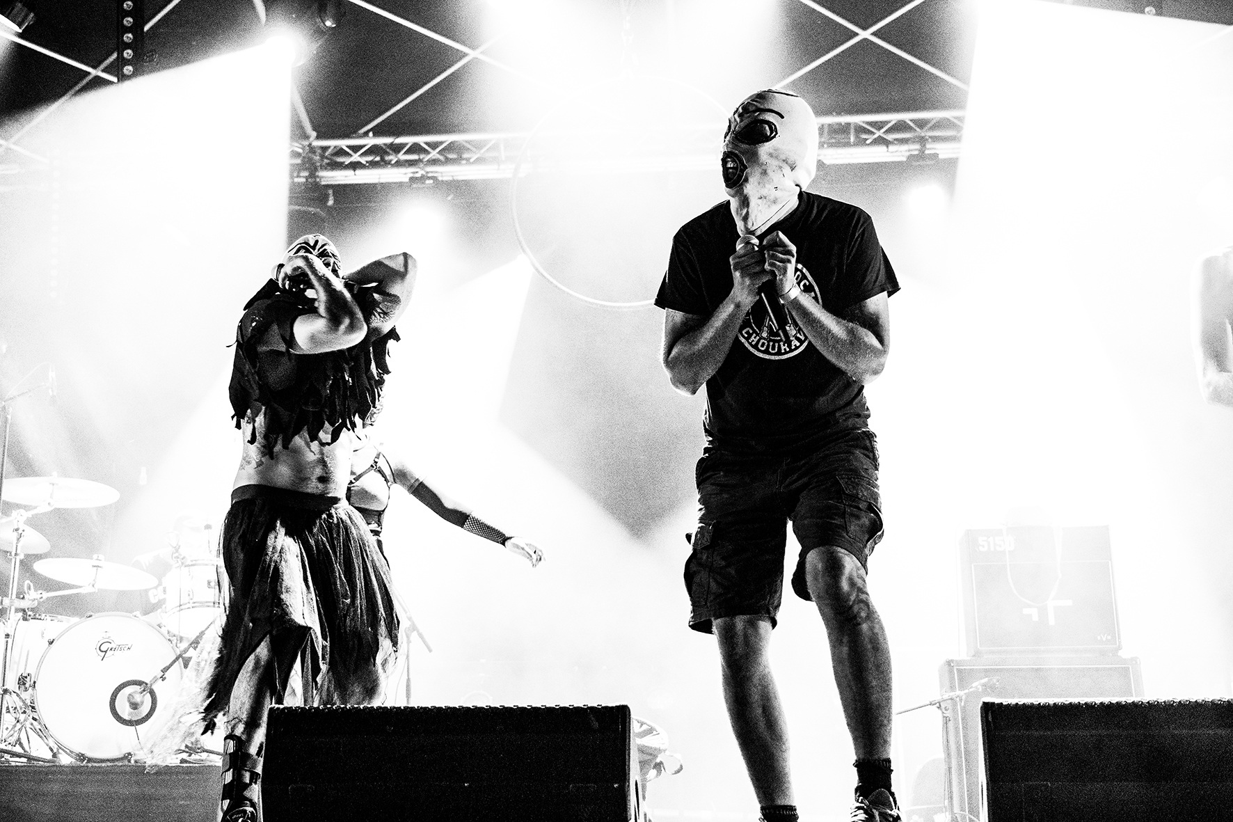 Il y a des concerts qui ne laissent pas indifférent, lorsqu’on fait de la photo. La troupe de Krave Boca oscille entre le show pyrotechnique et musicale, une recherche de la mise en scène extrême menée par une musique hurlante et rythmée. Les yeux et les oreilles sont sans cesse sollicités, pas de répit pour le corps non plus, en mouvement solitaire ou conduit par les vagues collectives, le corps bouge, exulte, se fatigue mais la troupe Krave Boca le soutient jusqu’au bout.