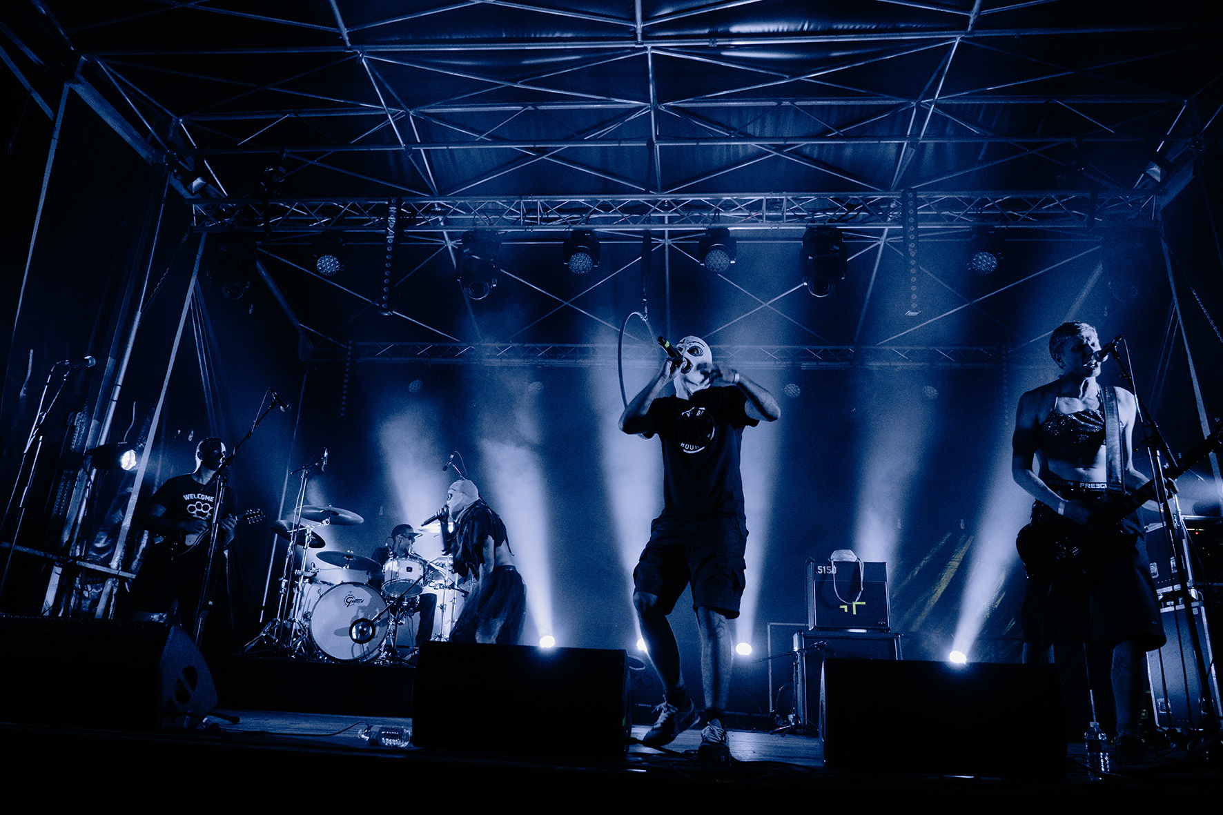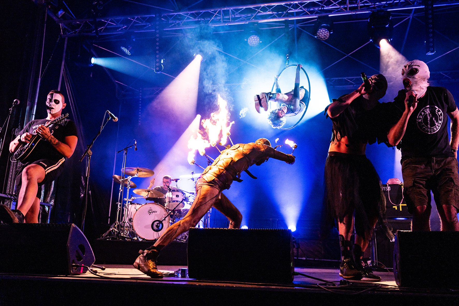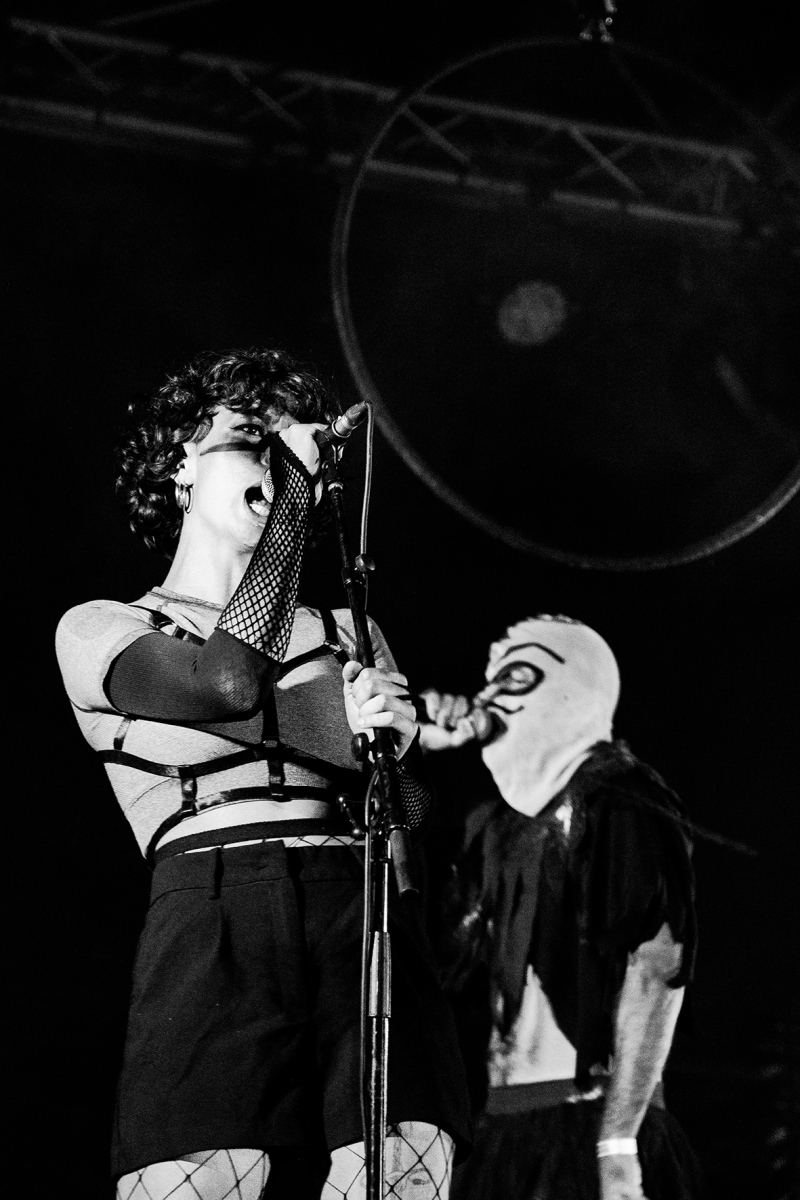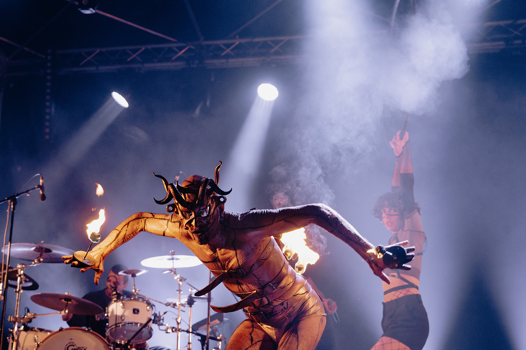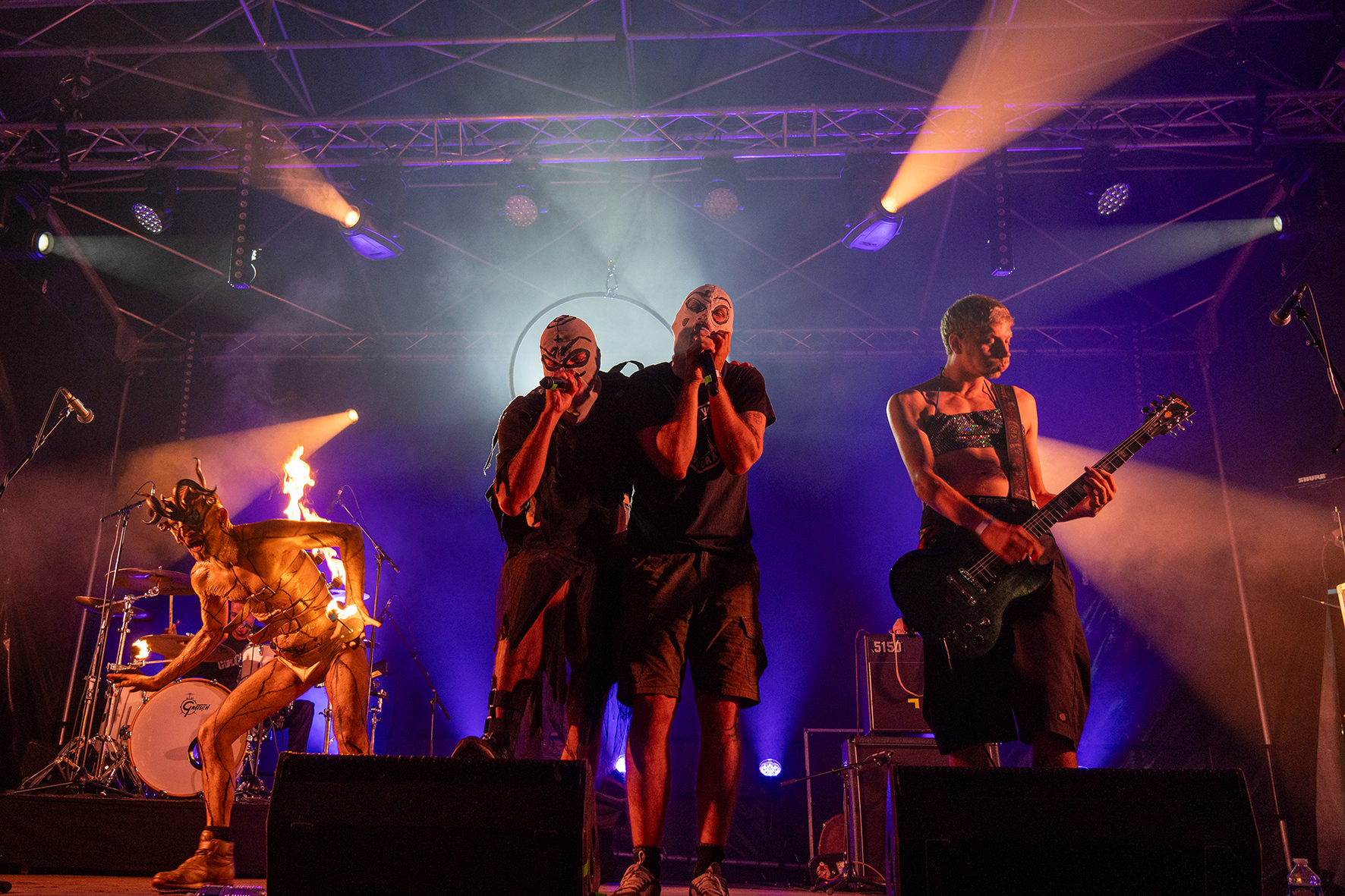 Il y a des concerts qui ne laissent pas indifférent, lorsqu’on fait de la photo. La troupe de Krave Boca oscille entre le show pyrotechnique et musicale, une recherche de la mise en scène extrême menée par une musique hurlante et rythmée. Les yeux et les oreilles sont sans cesse sollicités, pas de répit pour le corps non plus, en mouvement solitaire ou conduit par les vagues collectives, le corps bouge, exulte, se fatigue mais la troupe Krave Boca le soutient jusqu’au bout.