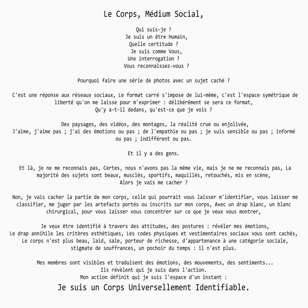 C’est dans le cadre du festival « Photo dans Lerpt » en 2022 que j’ai proposé ce projet photographique, une réflexion en réaction à l’image que l’on donne de soi sur les réseaux sociaux. Ce projet n’a pas été retenu lors de la délibération finale, mais je tenais à vous le proposer.